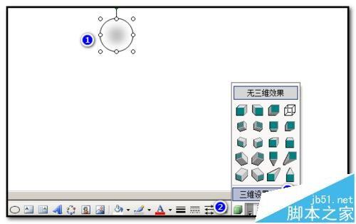 8、然后,选中此圆形,再在绘图工具栏中点“三维效果样式”;在弹出的菜单中点“三维设置”;