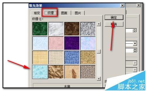 16、在“填充颜色”这里,点下小三角形,弹出的菜单中点选“填充效果”,转到“填充效果”操作框;然后,点选“纹理”这里,在“纹理”这里,选择“水滴”纹理;再点确定;回到“设置自选图形格式”操作框再点确定;