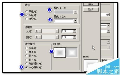 6、转到“填充效果”操作框;点选“双色”;在“颜色1”这里选择“灰色-25%”的颜色;在“颜色2”这里选择“白色”的颜色;在“底纹样式”这里选择“中心辐射”;在“变形”这里选择从左边数起第一个变形;然后点确定;转回到“设置自选图形格式”这里再点确定。