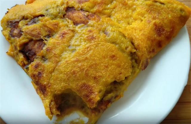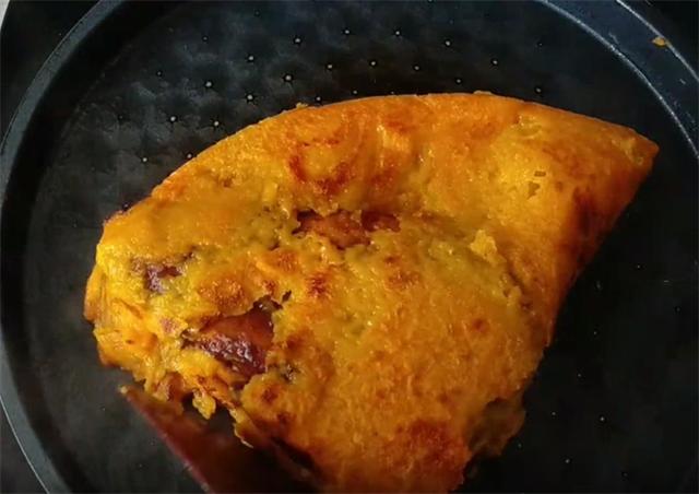 7.上面的面糊已经熟透,底面的微焦,这是我们利用盘子和铲子把面饼先对折,然后再次对折,这样就方便出锅了,而且层次也特别的多。