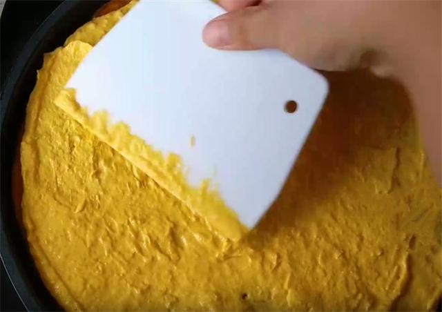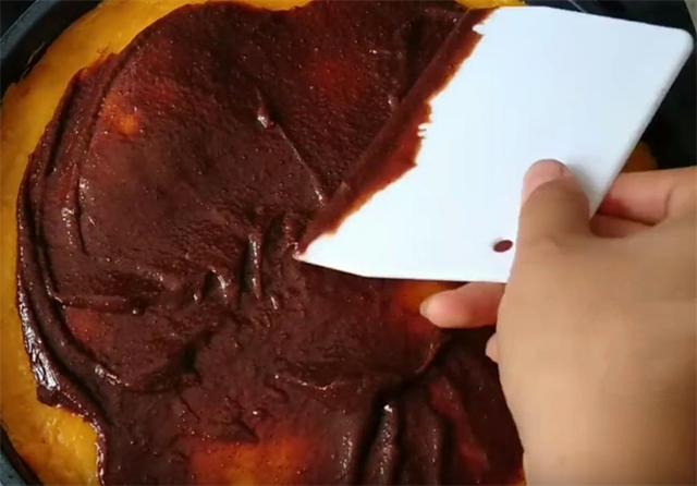 5.这个时候,底面的面饼已经熟了,然后我们倒上一些豆沙,快速的把它摊平摊均匀。