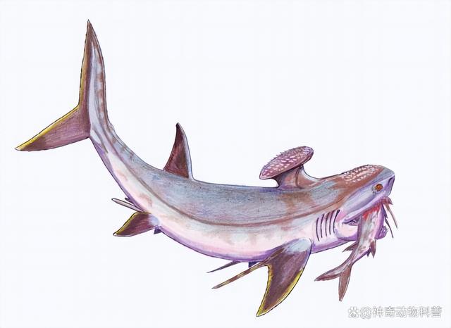 生活在1.5亿年前至1.3亿年前的侏罗纪时期。它是一种巨大的鱼类,据信可以长达27米,是已知最大的鱼之一。利兹鱼出现于2003年英国制作的《海底霸王》电影里,一只利兹鱼被地蜥鳄、弓鲛猎杀,最后被一只滑齿龙杀死,成了一群滑齿龙的大餐。上图是来自伦敦自然历史博物馆的尾鳍化石。 7、背鳍鲨(Stethacanthus)