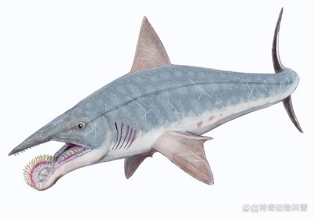 生活在3.2亿年前至2.7亿年前的二叠纪时期。它有着一排弯曲的锯齿状牙齿,被认为是一种食肉动物。几乎所有的化石标本都是螺旋排列的个体牙齿簇,称为“牙轮”,它们在生活中嵌入下颌。与大多数已灭绝的软骨鱼一样,骨骼大多不为人知。螺旋齿鲨的化石已在世界各地发现。 6、利兹氏鱼(Leedsichthys)