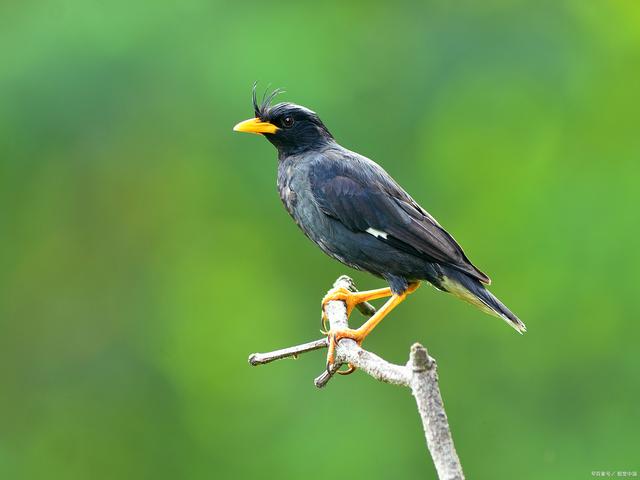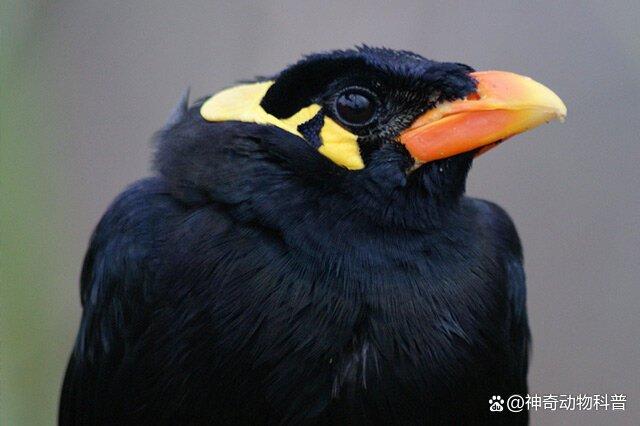 7、鹩哥 鹩哥通体黑色,头和颈具紫黑色金属光泽,眼先和头侧被以绒黑色短羽,头顶中央羽毛硬密而卷曲。雄性成鸟嘴须发达,额至头顶辉黑色,头侧被以绒黑色短羽;头后有两片桔黄色肉垂;眼下后方部分裸露;上体的后颈、肩和两翅内侧覆羽均为辉紫铜色;颏、喉至前颈紫黑色,前胸铜绿色,腹部蓝紫铜色,腹中央和尾下覆羽羽端具狭窄白色羽缘,雌鸟体色与雄鸟相似。