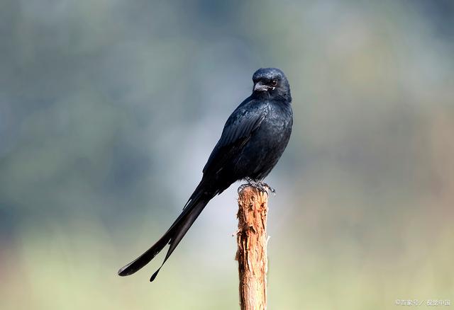 8、黑卷尾 黑卷尾通体黑色,上体、胸部及尾羽具辉蓝色光泽。黑卷尾雄性成鸟全身羽毛呈辉黑色,上体自头部、背部至腰部及尾上覆羽,概深黑色,缀铜绿色金属闪光;尾羽深黑色,羽表面沾铜绿色光泽;翅黑褐色,飞羽外翈及翅上覆羽具铜绿色金属光泽;下体自颏、喉至尾下覆羽均呈黑褐色,仅在胸部铜绿色金属光泽较著;翅下覆羽及腋羽黑褐色。