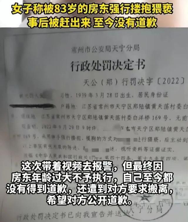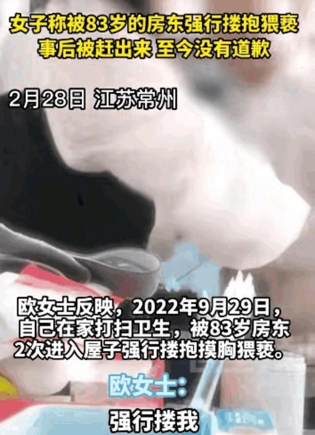 年龄从来不是问题,而是色胆色心不死。女子被83岁房东摸胸的视频引得网友热议后,人们也明白了事情的前因后果。83岁的张某,在江苏常州有多余的房子不住,他便将房子租给了欧女士。 欧女士和丈夫一同租住这个地方,平时她和丈夫同进同出,并没有发生什么奇怪的事情。可是在一次丈夫外出,不在家时,83岁的房东竟然不请自来,来到欧女士面前,趁其不备,直接动手动脚,做出摸胸之举。