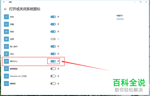 6. 第六步,我们可以看到如下图所示的“打开或关闭系统图标”页面,关闭“操作中心”后面的的开关,即将它变成白色,这样我们就成功关闭了页面右下角的操作中心。