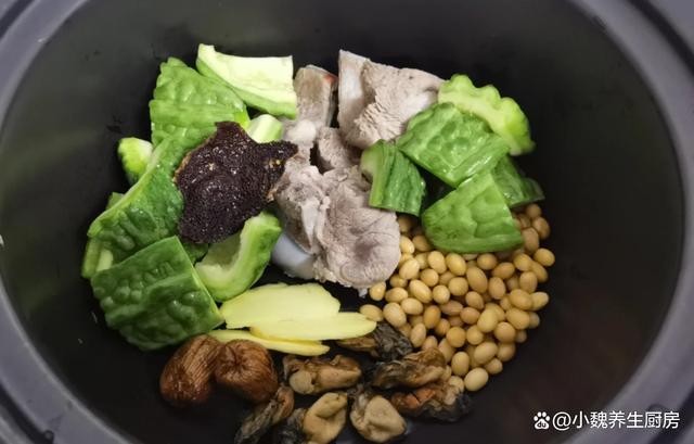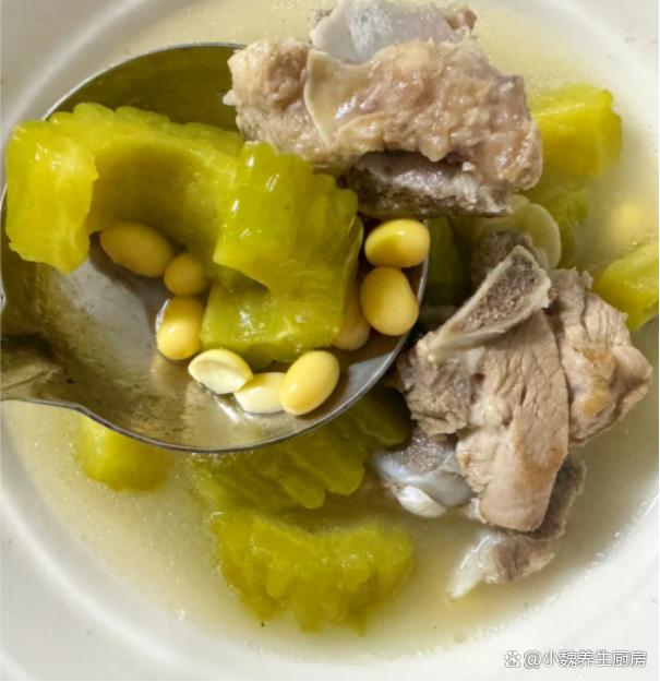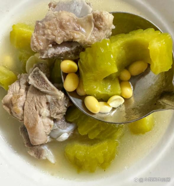 进入炎热的盛夏,每年七月中旬左右,都将要迎来三伏天,网友们戏称为“渡劫日”,因为各地气温都上升至35摄氏度以上,很多地方甚至突破40摄氏度,让人热得受不了,皮肤都被晒黑了,肌肤出现缺水,还特别容易中暑,导致白天工作没有精神。炎热的三伏天,可以不错小龙虾,但是一定别忘记喝汤,比如说这款苦瓜黄豆陈皮猪骨汤,做法特别简单,汤品特别鲜美,滋补身体,好处多多。伏天要吃苦,夏季少受苦!7月多喝这汤,消暑解热,增强免疫力。  【苦瓜黄豆陈皮猪骨汤的正确做法】 准备食材:挑选1-2个苦瓜(苦瓜是夏季最受欢迎的蔬菜之一,苦瓜是许多年轻人不敢吃的蔬菜,吃起来略微有一些苦涩,上了年纪的人喜欢吃,富含大量维生素C,矿物质和营养成分,热量非常低,夏季非常适合炖汤或凉拌,帮助消暑解热,好处多多),陈皮一大块,几个蜜枣,老姜一大块,少许温开水和冷水,新鲜猪骨700克(如果家里人少一些,可以用少一些的猪骨,猪骨经过焯水去腥,搭配黄豆和苦瓜煲汤是绝配),大葱一小节,料酒或花雕酒若干,少许食盐,一小把干黄豆,胡椒粉和其他。 具体制作顺序:1:提前购买苦瓜,黄豆,陈皮和新鲜猪骨,提前把猪骨全部剁成块状,放在大一些的容器里,加上食盐或面粉,用手不停地揉搓,吸附里面的脏东西,用冷水冲洗掉血水,或者多换几次水,将猪骨完全清洗干净。 2:两个苦瓜的外皮用盐水泡一泡,切成两头部分,用工具挖出里面的瓜瓤,反复清洗干净,切成厚一点的片状。3:苦瓜会有一些苦涩,可以用盐水浸泡,陈皮提前温水泡发,用刀刮掉里面的脏东西,蜜枣也清洗干净,放在一旁备用。 4:大葱洗净斜切成小段,生姜切成薄片,黄豆提前泡发60分钟,彻底清洗干净,将黄豆泡发开。