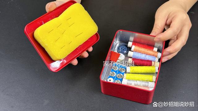 妙用二:收纳针线。 闲置的茶叶盒我们还可以将它改造成一个收纳针线的好帮手,虽然说现在的生活条件好,很少会穿带有补丁的衣服,但在扣子掉落、开线等情况时,针线依旧是必不可少的。然而,针非常的细小,不收纳好就很容易丢失,要是被孩子拿到玩耍,还容易扎到自己。而线的话,也容易缠绕在一起。所以,我们就需要将针线都好好收纳起来了。利用铁皮茶叶盒改造收纳针线工具的方法也很简单,先拿块百洁布,将百洁布用双面胶粘在茶叶盒的盖子上。要是百洁布比较大,我们就将它裁小一些。粘好后,就可以将针都插在上面收纳了,这样不仅不容易掉落,而且还整齐,拿取非常的方便。