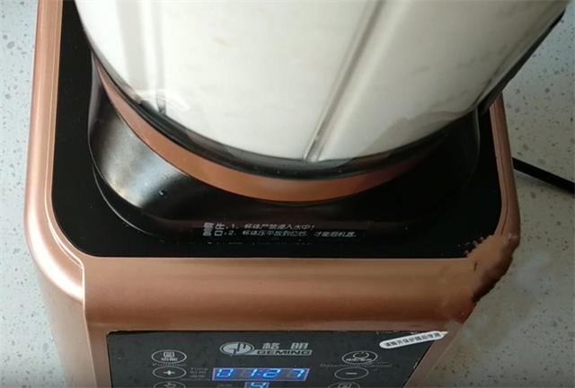 2.然后把大米倒入料理机,加入200毫升的温牛奶,这样发酵的速度能更快一些。接下来我们放入三克酵母,温牛奶加入酵母,这样能够起发的更快一些,一定要反复多打几次,米浆打的越细腻,做出的米糕口感也就越细腻越好吃。