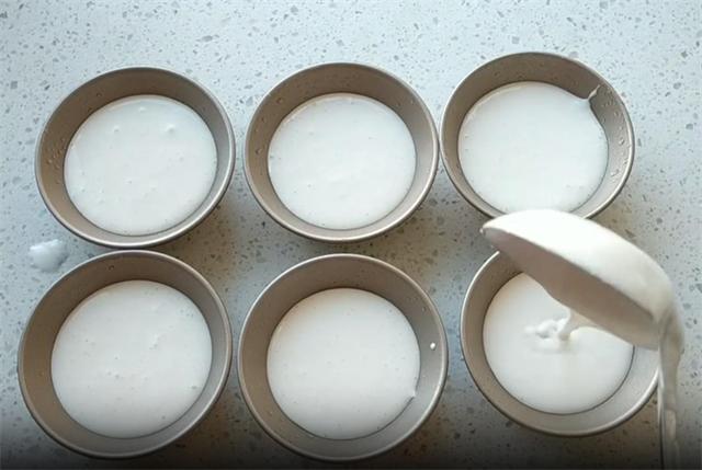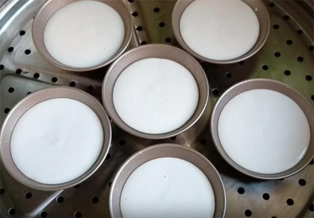 5.在模具上均匀的刷上油,这样更容易方便脱模,倒入米浆大约到8到9分满即可,这时我们把蒸锅烧至温热即可,一定不要太热,这样酵母会被烫死。