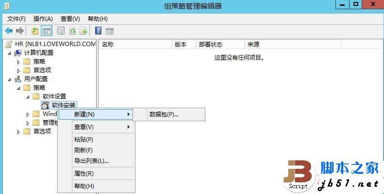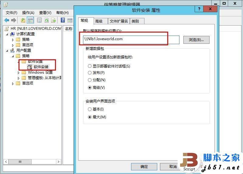 我们在组策略上面展开用户配置-策略-软件设置-软件安装,然后打开软件安装的属性,这里解释下,我圈起来的数据包位置其实是打开NLB1 DC的共享的目录,我将需要分发的软件放到了一个共享的文件夹内,这样才能保证test这个OU里面的对象都能访问到需要分发的文件