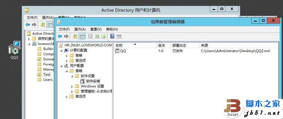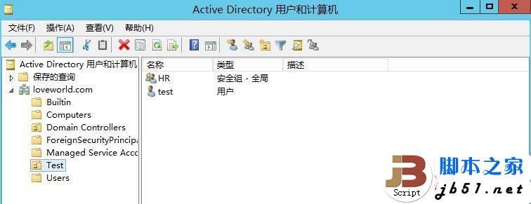 以下操作是在NLB1 DC上面做的分发软件之前,我建了个OU,为Test,在Test里面有一个用户test,他是属于HR工作组的,如图,大家根据这个图,大家将自己的机器的配置设置的和我图片上的一样就可以了
