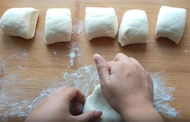 7.面团变得很硬的时候,我们把它搓成长条,下六个面剂,越揉越能排净里面的空气,这样二次醒发的时候,气孔才会更加细腻,口感也更紧实。