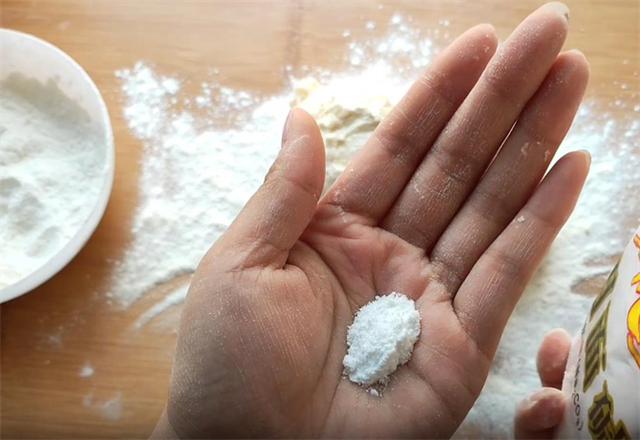 5.面团经过一宿的发酵会有一些酸味,我们要加入约1.5克的碱面,一是中和酸味,二是使馒头的口感更加筋道。