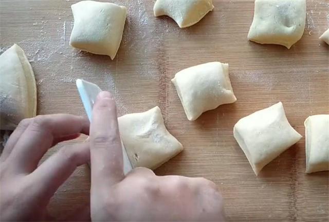 4.接下来我们把醒发好的面团放在案板上,撒一些干面粉,把它揉搓排气,多揉一会儿,这样二次醒发的时候它的口感会更细腻,搓成长条下16个面剂。