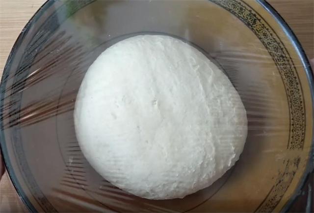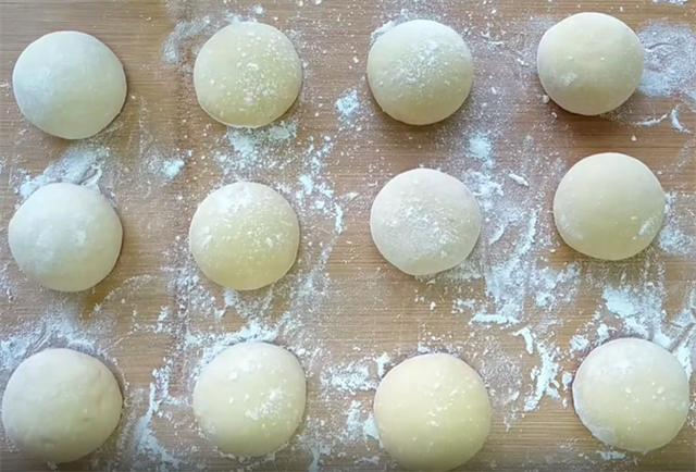 5.然后像这样把面剂搓成圆形的饼坯备用,在饼坯的上面和下面撒上一些干面粉,防止粘连,盖上保鲜膜二次醒发25到40分钟,醒发至体积明显变大即可。