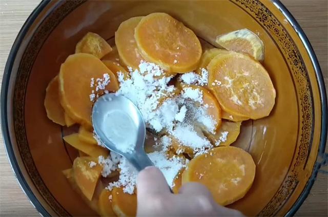 1.今天和大家分享一个红薯烤饼的做法,香甜松软,比面包还要好吃,做法非常简单。首先我们准备一根红薯,洗净去皮之后的重量约为250克,切成薄片,上锅蒸熟,加入15克白糖,把它按压成细腻的红薯泥,糖的量可以依据个人口味增减。