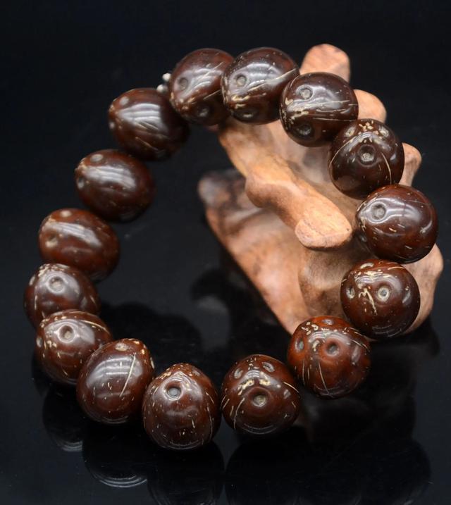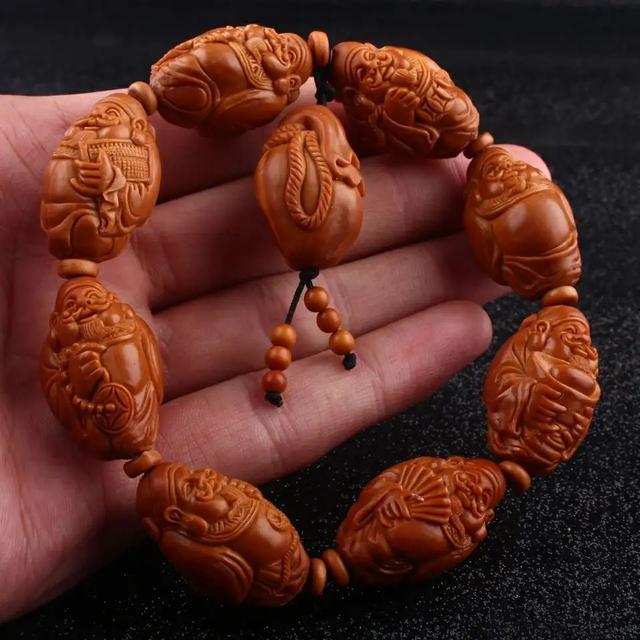 第三个就是橄榄核的手串,橄榄核在文玩圈一直是有点高高在上的优越感,毕竟它是有历史有传承的,九年义务教育阶段大家都学过一篇《核舟记》的文章,盘完之后的橄榄核是最有信任危机的一款手串,毕竟它太漂亮了,太像塑料了,所以很多人就不敢轻易的入手,目前在市场上没有看到过塑料的橄榄核,随着现在机械工艺的普及,机雕的橄榄核价格也很实惠了,相对于原来动辄一条万八千的手工核,对于我们普通的玩家来说百八十块,三两百块买一条机雕核,完全可以满足我们的盘玩需求,放心肯定不会买到假的塑料的。