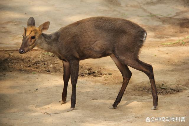 4、越南大麂 越南大麂又名越南马麝鹿,是一种小型鹿类动物,分布在越南北部的高山森林中。它们是一种相对较新发现的物种,直到1994年才由一位法国猎人发现。越南马麝鹿身体短小,只有成年兔子大小。它们通常体长为50-70厘米,肩高约40厘米,重量仅为10-15公斤。它们有着浅褐色的毛发,腹部比背部浅色,眼睛较大,有黑白色的眼圈。雄性比雌性略大,并且有两个犬齿。越南马麝鹿主要在黎明和黄昏活动,以草本植物、树叶和水果为食。它们非常敏捷,善于通过跳跃和爬行来逃避天敌。虽然目前还不清楚它们的具体数量,但它们面临着栖息地破坏和非法捕猎等威胁,被列为濒危物种。
