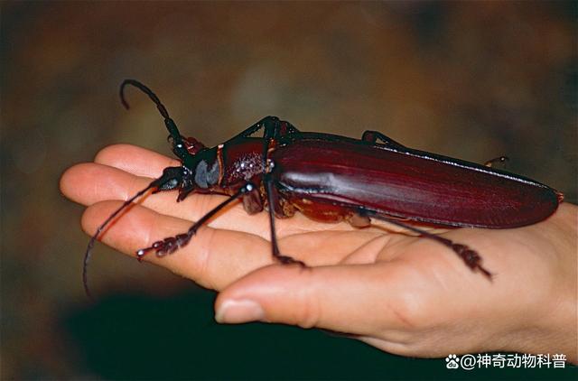 泰坦甲虫是一种生活在南美洲热带地区的昆虫,也被称为巨大天牛或泰坦象鼻甲。它们属于天牛科中的泰坦甲虫亚科,是世界上最大的甲虫之一。泰坦甲虫的体型非常庞大,雄性的身体长度可达10厘米以上,体重可达100克左右,而雌性相对较小,身体长度约为6厘米。它们具有硬壳和强壮的触角,可以用来挖掘土壤和寻找食物等。泰坦甲虫主要以腐烂的植物为食,也会吃其他昆虫和腐肉。它们通常在夜间活动,白天则躲在树洞、土洞或废墟中休息。由于泰坦甲虫的巨大体型和异样的外貌,在古代文化中经常被视为神秘和神圣的存在。而现代人则更加关注它们在生态系统中的作用,因为它们能够分解腐烂的植物物质,维持生态平衡。 3、竹节虫(学名:Gongy10pus adyposus Brunner)