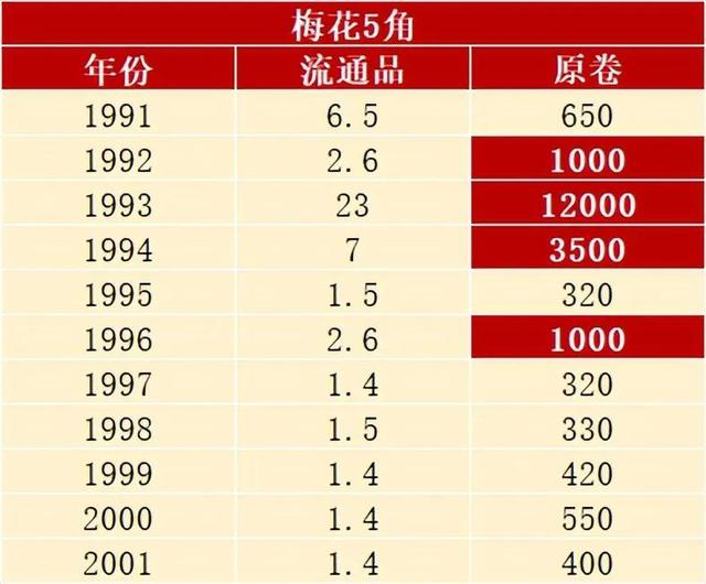 这种金灿灿的5角,可以说是所有流通硬币中,最受欢迎的。即便是普通人,因为颜值也原因收藏保存几枚。 如今,梅花5角虽然还在流通,但因为收藏的人越来越多,已经很少出现在日常生活中了。 那么,这种硬币究竟值多少了呢?我们一起来了解一下。注意,它们之中珍贵的版本,已经在拍卖会中突破1万了! 普通的梅花5角梅花5角是从1991年开始发行的,要持续发行到2001年。