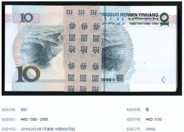 在2023年香港SPINK的拍卖会中,就出现了一刀1999年的10元纸币,它拍出了3120港币,差不多是2700多,一刀纸币是100张,也就是说单张10元已经要27了,当然这是品相全新的,如果是旧纸币市价可能要低一些,但是一张也不再是面值。
