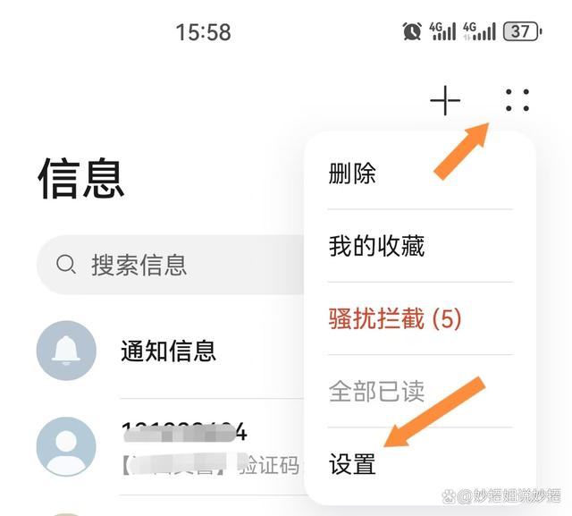 如果觉得在设置中开启这两个开关比较麻烦,我们还可以在短信APP上面进行设置。返回到桌面,打开手机短信,点击右上角的四个点,然后点击设置,进入短信设置界面。同样地,将恶意网址识别和验证码安全保护这两个开关开启即可。