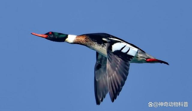 8、红胸秋沙鸭 红胸秋沙鸭(学名:Mergus serrator)是一种中等大小的水鸟,身体修长,翼长而尖。它们是善于潜水捕食的鸟类,主要栖息在淡水湖泊、河流和沼泽地带。据资料显示,红胸秋沙鸭的飞行速度大约为60-70公里每小时。当然,这个速度还会受到多种因素的影响,比如风速、气压等等。不过总的来说,红胸秋沙鸭的飞行速度算是较快的。
