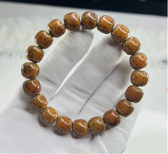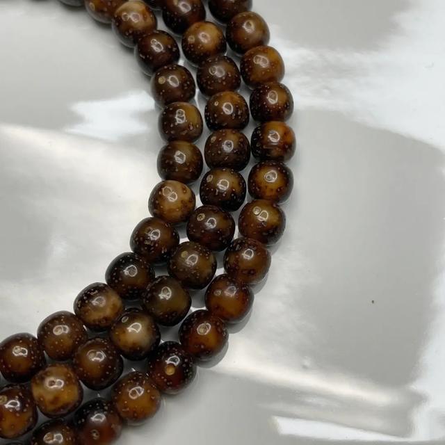 相比脱脂星月它虽然说前期上色慢,油性略微显得有点差,并且前期容易有色差,但是随着现在挑选标准的提高,同树籽以及同枝籽像这种情况尽可能的也可以减少色差的问题,脱脂星月的亮点就是经过5年或者8年的盘玩之后,珠子的表面裹上一层厚厚的包浆,亮金红褐色的颜色,其实是在对岁月最好的见证。