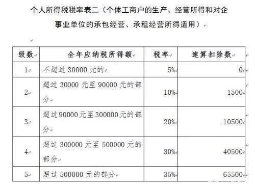 1、查账征收 查证征收是根据收入减除各种人员工资,社保等成本费用后的年税前利润,实行五级累进制,缴纳5%——35%的个人经营所得。 具体计算公式为:应纳税额=全年应纳税所得额*适用税率-速算扣除数 =(全年收入总额-成本费用及损失)*适用税率-速算扣除数 适用税率以及速算扣除数根据应纳税所得额查《经营所得个人所得税税率表》来确认。 需要注意的是,个体工商户业主的工资在税前不允许扣除,业主费用扣除标准统一为6万/年。