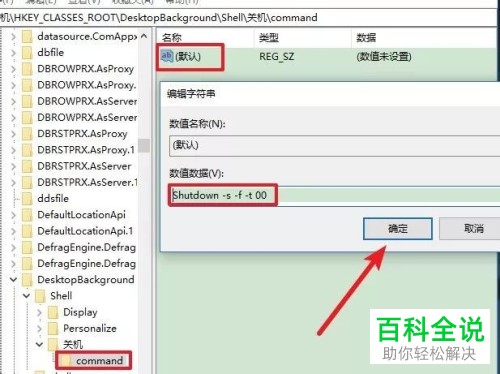 8. 第八步先点击【command】,接着双击【默认】选项,在弹出的窗口中将【数值数据】修改为【Shutdown -s -f -t 00】,然后根据下图箭头所指,点击【确定】。