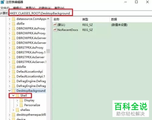 2. 第二步打开【注册表编辑器】窗口后,根据下图所示,依次点击【 HKEY_CLASSES_ROOT\DesktopBackground\Shell】文件夹。