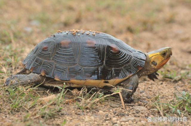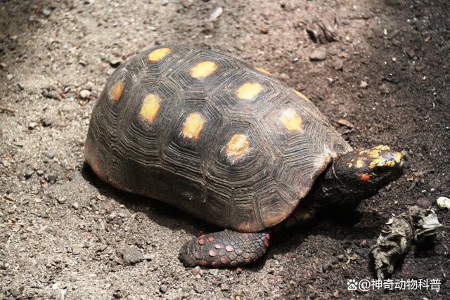9、红腿陆龟(40—60年) 红腿陆龟,其学名为Geochelone carbonaria,隶属于陆龟科。通常情况下,它的体长约为30厘米左右,最大可达45厘米。红腿陆龟的颜色非常鲜艳夺目,十分吸引人的眼球。由于其容易饲养、食量大等特点,因此是很多饲养陆龟初学者的理想选择。红腿陆龟分为哥伦比亚红腿和加勒比海岛屿红腿两个亚种。老版红腿个体较大,头部没有明显斑纹,但背甲在生长到一定程度后中部会有向里凹陷的现象。而樱桃红腿体型相对较小,头部则有明显的红色斑纹。即便成年后背甲形状不会收缩,仍然呈椭圆形。