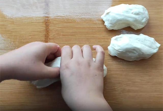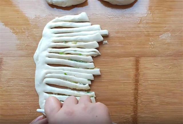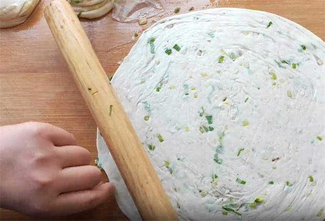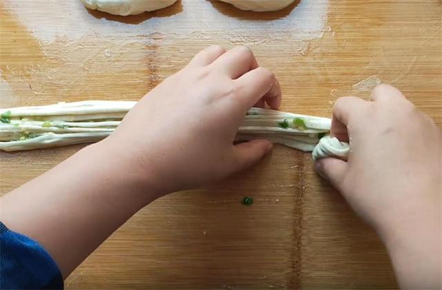 5.然后我们把它抻长卷起,这样我们饼的生坯就做好了。