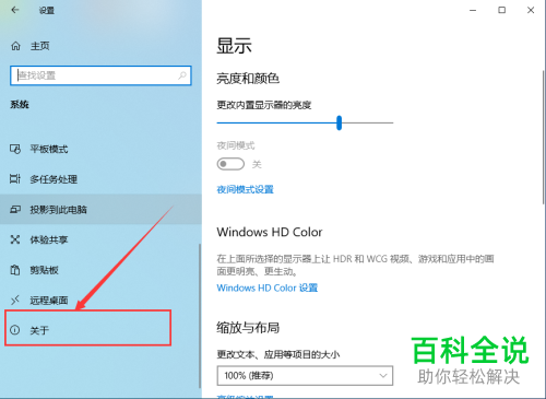 3. 第三步进入【系统】页面后,根据下图箭头所指,点击左侧【关于】选项。