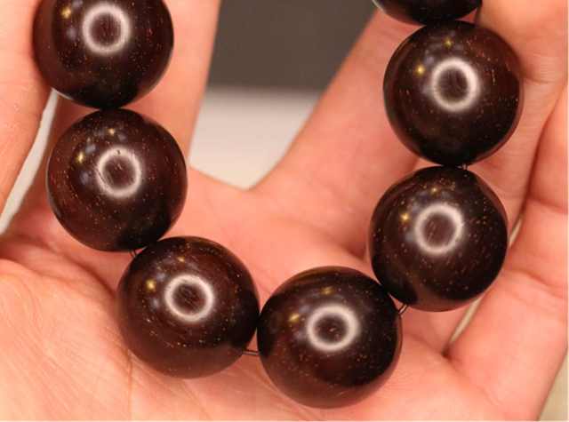 印度小叶紫檀是什么味道的?图片中是一条老的紫檀老料的珠子看起来是平平无奇,但是味道真的是很惊艳,可以闻到非常清晰的巧克力甜香气,紫檀的香气现在真的是被很多朋友忽略掉了,现在大家一股脑的去追求金星,水波纹,龙鳞纹,鸡血红,但是往往忘了紫檀的学名叫檀香紫檀,檀香气也是老料非常大的一个特征。