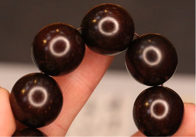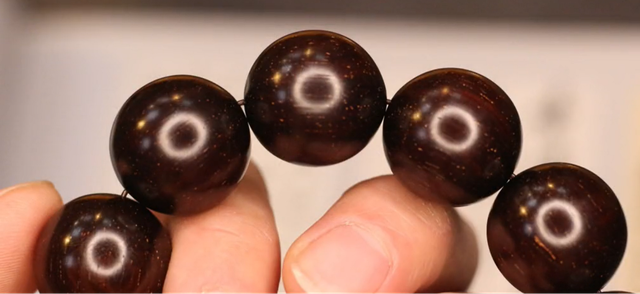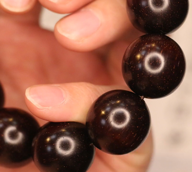 第二点就是工艺,现在从商家到玩家都过分的去追求荧光感和细腻性,大家看图片中这条佛珠,像这种老料并没有像大家想象的什么玻璃底,现在直播间里总说视觉无棕眼,其实大多数都是通过高抛工艺来达到的,紫檀根据切面方向不同,一定会有清晰的棕眼或者牛毛纹,这种佛珠以前打磨就是打磨到1000目,现在一条佛珠都得打磨到3000目,这种高抛确实可以让佛珠显得棕眼更细腻,荧光感更好,但是这样也会盖住紫檀本身香气的散发,所以这到底是件好事还是坏事也没法说。 |
