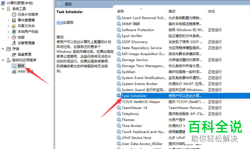 3. 第三步打开【计算机管理】窗口后,先点击左侧【服务】,接着在右侧页面中根据下图箭头所指,找到并双击【Task Scheduler】选项。