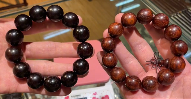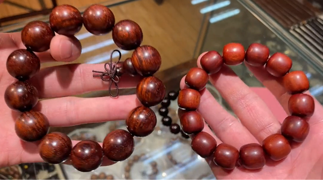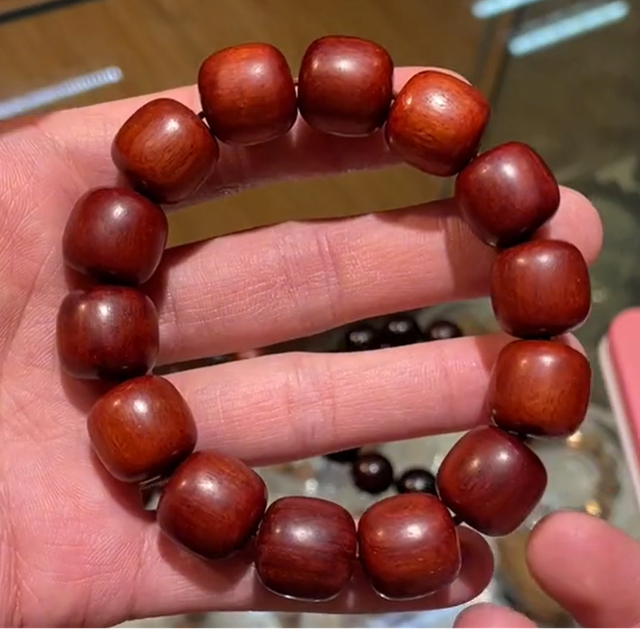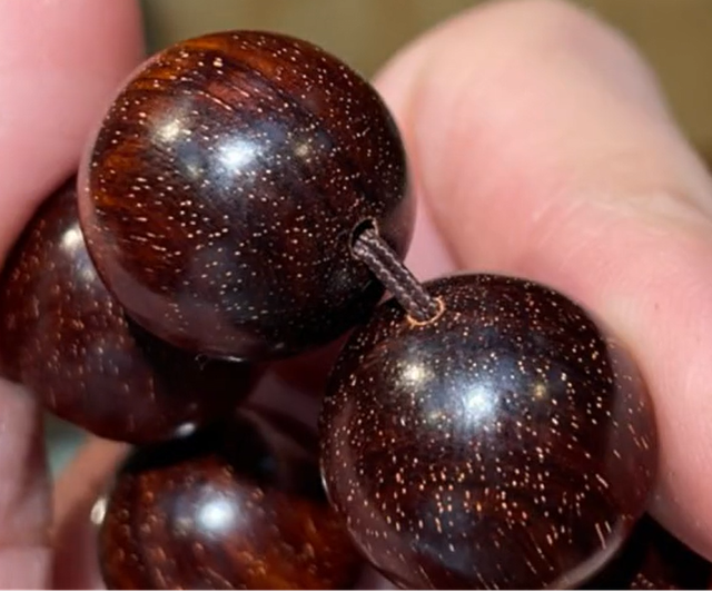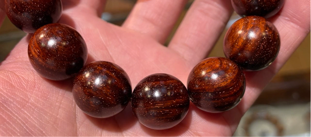 紫檀的树心料就算是油性再差,也可以看到清晰的树心的年轮纹理,但是像这种纹理特别的淡,特别的模糊几乎是看不到纹理,这种就一定是血檀的,这种是很好区分的,这个就是我们说的能图判,看张图片就可以判断的,今天的主人公是图片中这一条18mm血檀赞比亚的料子,这种的成本20多块,这条珠子就算是很多商家也很难通过图片,或者视频来判定它到底是血檀还是紫檀。