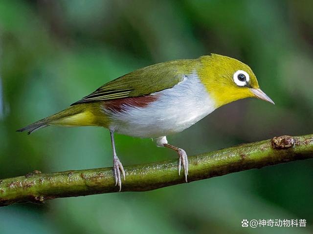 4、黄腹绣眼鸟(学名:Zosterops fuscicapillus) 黄腹绣眼鸟又称为棕顶绣眼鸟,是一种小型的绣眼鸟,它们身长约10厘米左右,重量大约为7克。其头顶、颈侧和背部呈披肩色或橄榄绿色,眼睛周围有一圈白色的眉毛,并且有一个明显的白色眉斑。喉部和胸部呈淡黄色,腹部为白色。黄腹绣眼鸟主要分布在印度尼西亚的苏门答腊岛。它们主要栖息在海拔2000米以下的低地和山地雨林中,也会出现在植被较为稀疏的芦苇和灌木丛中。棕顶绣眼鸟主要以昆虫为食,但也会吃果实和花蜜。 由于黄腹绣眼鸟的栖息地遭受到了人类活动的破坏和森林的砍伐,加上采摘和非法贸易等因素的影响,导致它们的数量越来越少,已被国际自然保护联盟(IUCN)评估为濒危物种。 |