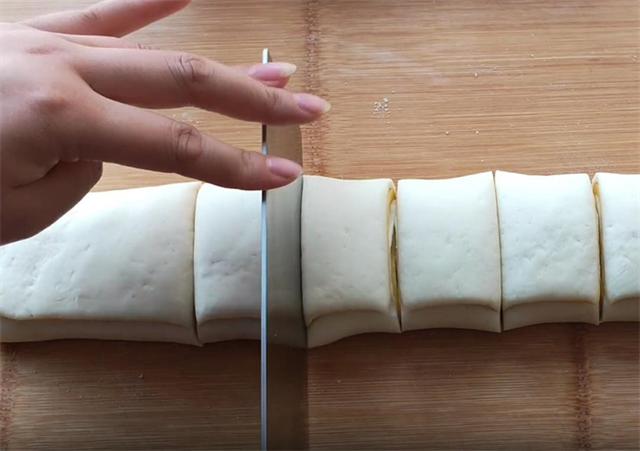 8.加油酥就是能够使它的层次分明不粘连,然后我们切8到10个面剂。