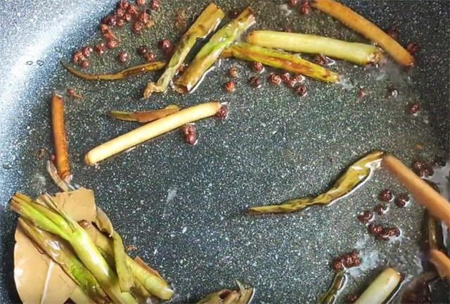 4.锅内放入约40毫升的食用油,加入干料煸出香味,再下入小葱煸炒至褐色即可出锅。