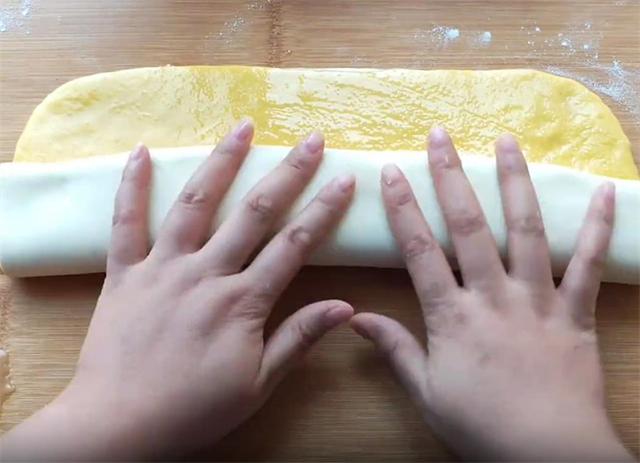 7.然后我们搅拌一下油酥,这样能够盐度均匀,在白色面皮上均匀的涂抹油酥,再把黄色的面皮覆盖在白色面皮上,然后再涂抹上一层油酥,像这样卷起即可。