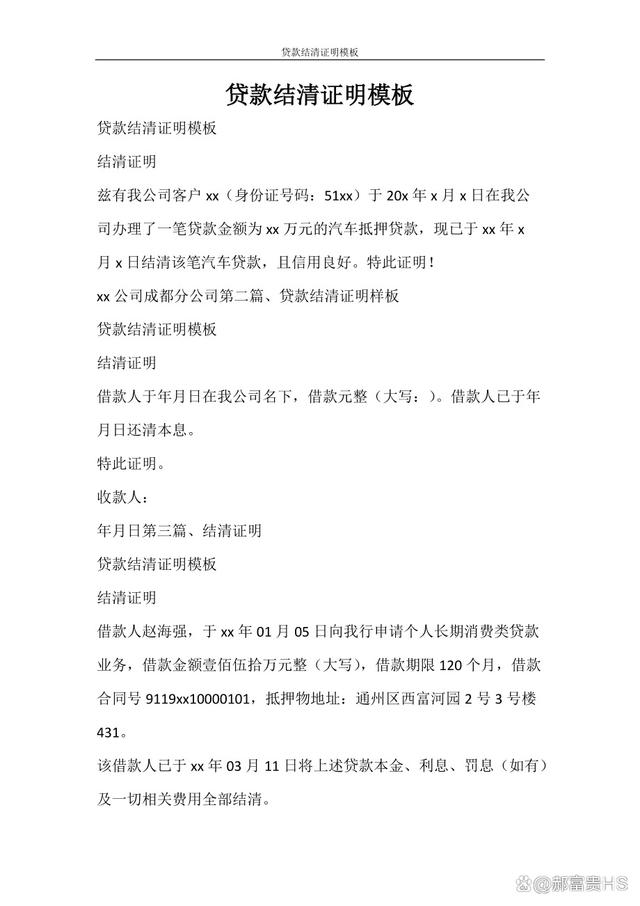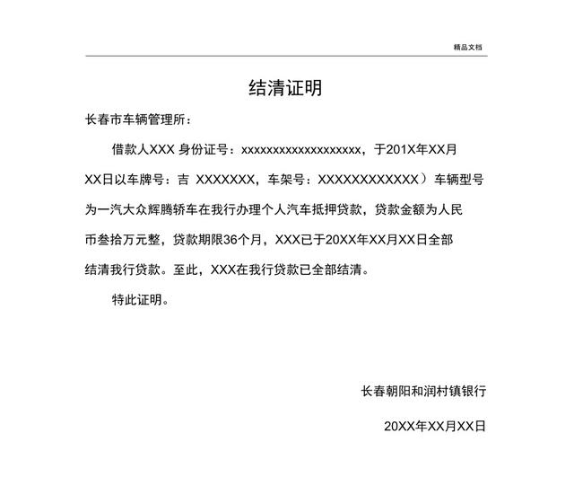 银行贷款结清证明是一种重要的文件,它证明你已经履行了贷款合同的所有条款,并已全部偿还了贷款。这个证明在许多情况下都是必要的,比如在申请新的贷款、办理房贷、车贷等金融业务时,银行需要了解你的信用状况和还款能力。 一、贷款结清证明的内容和格式首先,你需要了解银行贷款结清证明的内容和格式。一般来说,这个证明会包含你的个人信息、贷款信息、还款记录以及结清状态等。有些银行可能会提供标准格式的证明,而有些银行则可能需要你提供其他资料。因此,在开具证明之前,最好先与你的银行联系,了解具体的操作流程和所需资料。 二、准备相关资料在开具银行贷款结清证明之前,你需要准备好相关的资料。这包括但不限于你的身份证、贷款合同、还款记录等。如果你的贷款合同已经丢失,可能需要到银行进行补办。此外,如果你的贷款已经全部偿还,还需要准备好银行的还款凭证或对账单等证明文件。 三、前往银行办理接下来,你可以前往你所贷款的银行进行办理。在办理之前,最好先进行预约,避免因为排队等待而浪费时间。到达银行后,你需要将相关资料提交给银行工作人员进行审核。如果资料齐全且无误,银行会为你开具贷款结清证明。 四、后续处理在拿到银行贷款结清证明之后,你需要妥善保管这个证明文件。在需要使用时,可以随时向银行申请出具原件或复印件。此外,如果你还需要办理抵押登记的注销手续,也需要带上银行贷款结清证明和其他相关资料到当地的不动产交易中心或车辆管理部门进行办理。
