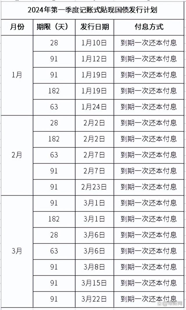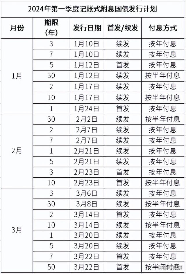 一季度有哪些国债要发行?我国的国债基本上是一年四季都不会间断,所以正常之下每个月都会有国债发行。2024年一季度的国债发行计划,已在年前就已经公布了。下方为具体的发行计划情况。 首先来看记账式附息国债。记账式附息国债的期限都是在1年及1年期以上的,对标的是1年期及以上的存款。 不过,记账式附息国债的期限更多一些,除了银行存款具有1、3、5年几种期限的外,还有7、10、30和50年期限的产品。(www.ws46.coM)