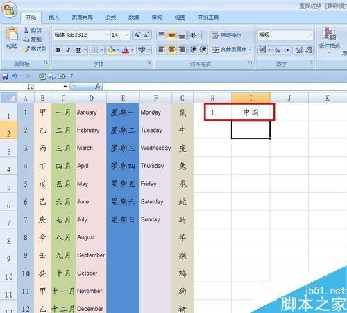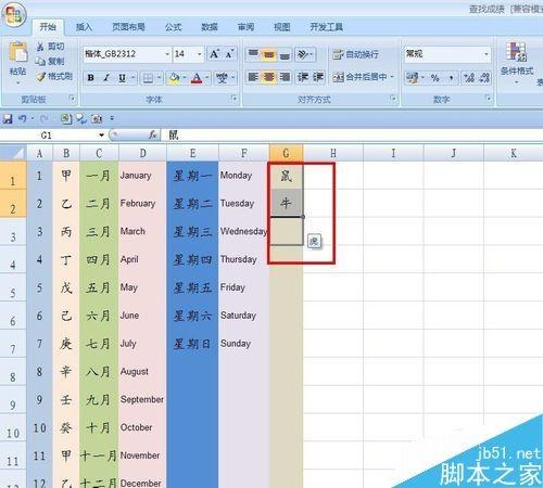 这时候我们在原来的工作表中试试,在G1、G2中分别输入鼠、牛,向下拉填充手柄,看看效果,是不是得到我们要的效果了。
