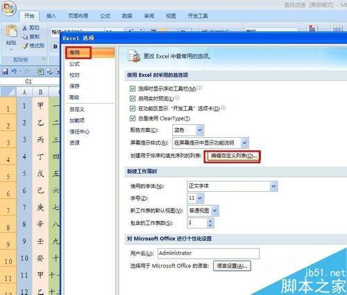 还有一些我们常用的序号,在EXCEL中没有办法直接输入,我们可以通过自定义来实现,在G列中输入鼠、牛……,选定单元格,单击OFFICE——EXCEL选项——常用——编辑自定义列表,单击弹出对话框,点击导入,可以看到我们导入的序列,点击确定。