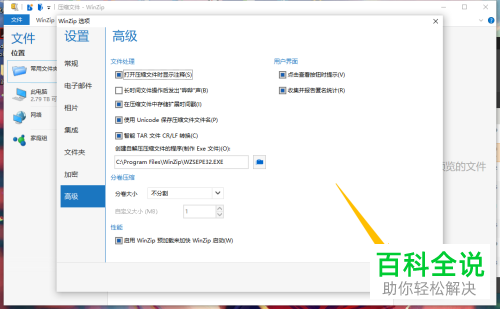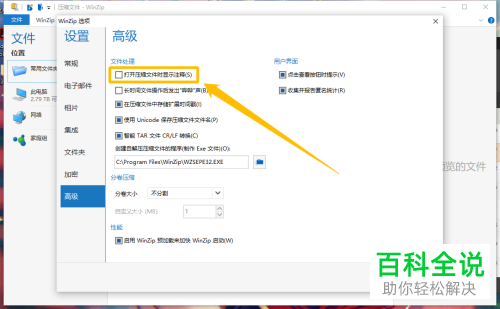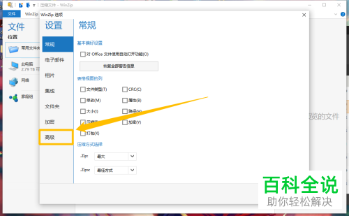 2.打开压缩文件时显示注释1. 第一步,在下图所示的设置页面中,点击页面左侧的高级选项。