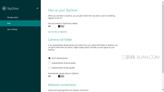 事实上,由于SkyDrive对于Windows8.1来说是如此的重要,以至于微软在Modern style的PC设置中单独给它留了一大块地方。通过大量的设置选项,现在你就可以在不同的设备当中实现同步,好赞!但是,如果你真的想如此享受你在云中的生活,还是需要向下好几层找到选项,然后进行操作。 打开Charm工具栏,选择“设置” > “更改PC设置”。打开SkyDrive的选项,然后在菜单中选择文件。来源: www.ws46.com 这样你的电脑就具备了默认自动存储文档和照相机文件夹中的图片到SkyDrive的功能。如果你愿意,可以使用任意一台Windows 8设备连接SkyDrive查看图片,然后就像在使用自己的电脑一样简单方便。 Quiet Hours设置